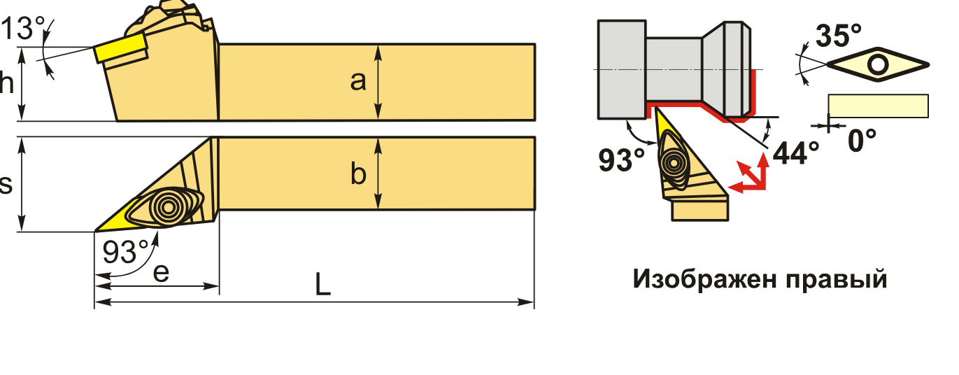 Резец токарный для наружного точения по металлу со сменными пластинами. Для пластин VN**1604**. Державка токарная с креплением типа D (двойном прижим кронштейном). С углом в плане 93°. Для обработки по контуру.